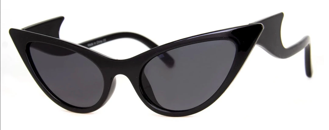 Sugar Pie – black cat eye plastic sunglasses with winged arms and dark gray lenses.