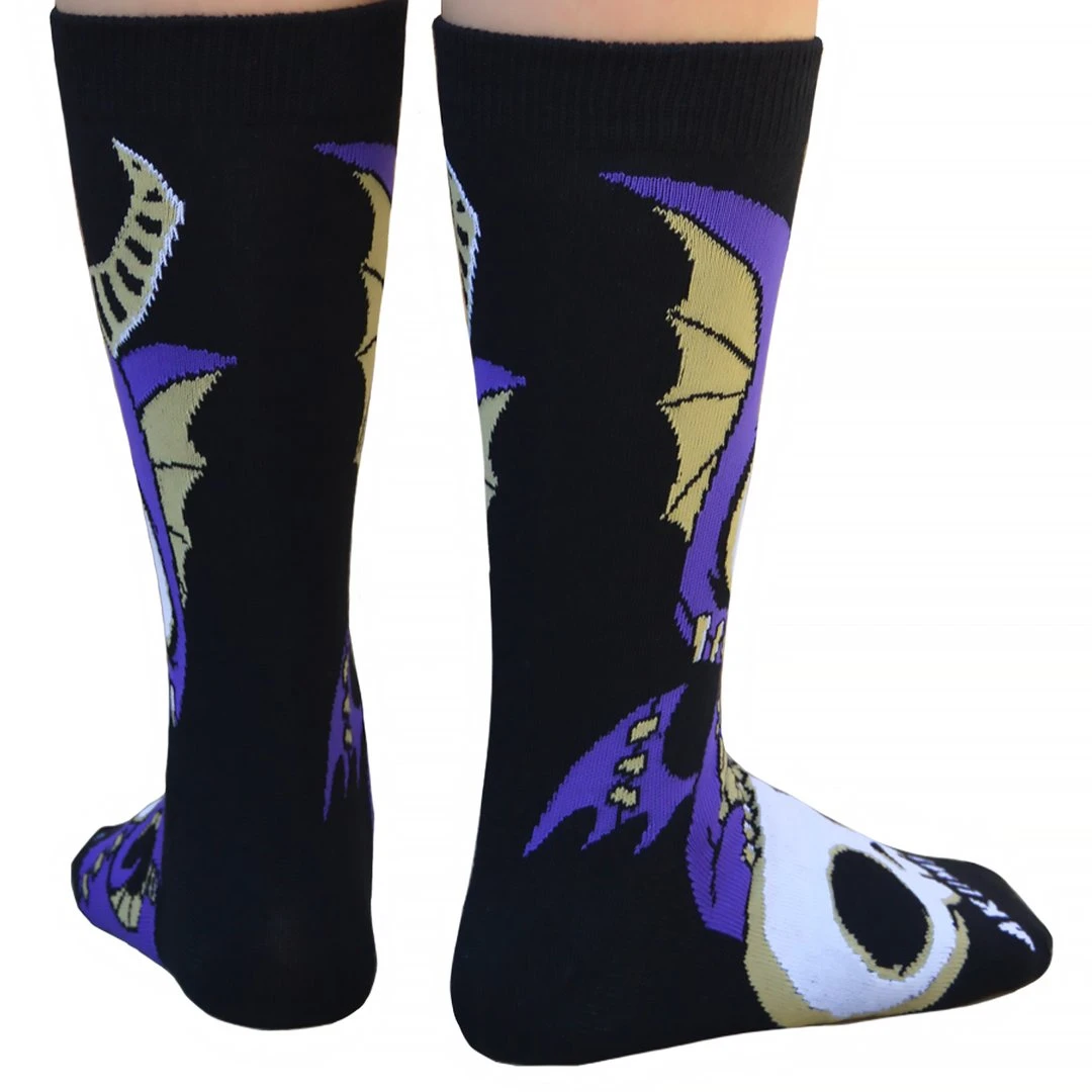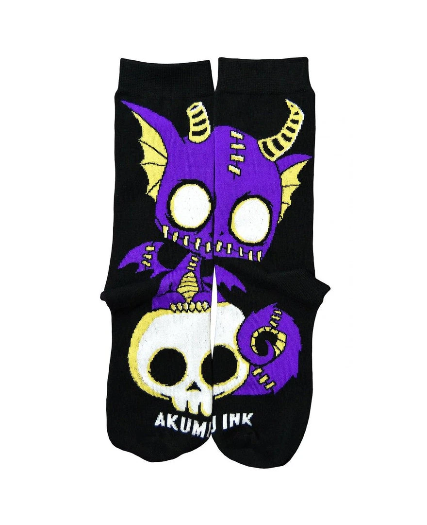 These Akumu Ink socks are comfortable knitted mid-calf socks. The hand-drawn artwork of a purple dragon sitting on his master’s skull long after he passed.