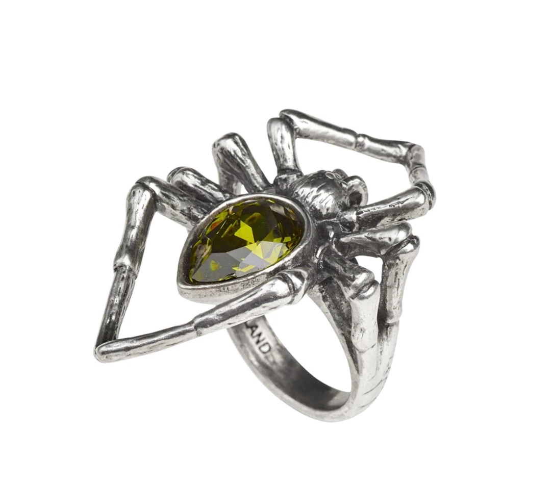 A giant spider, polished pewter ring with a large emerald green Swarovski crystal body.