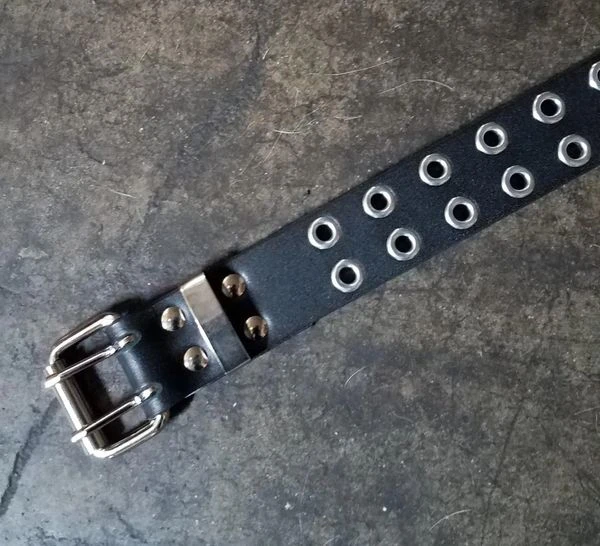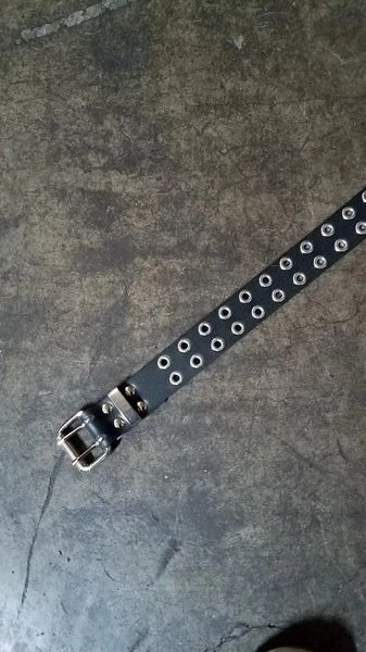 Description:Â Genuine leather two row eyelet belt. 1 1/2″ wide with two prong roller buckle and metal keeper.