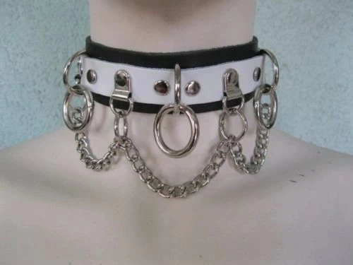 Bondage choker made of high quality leather and metal chain. The choker is 1 1/4″ wide with a 3/4″ strap. The hardware is all bright nickel plated with a buckle closure.