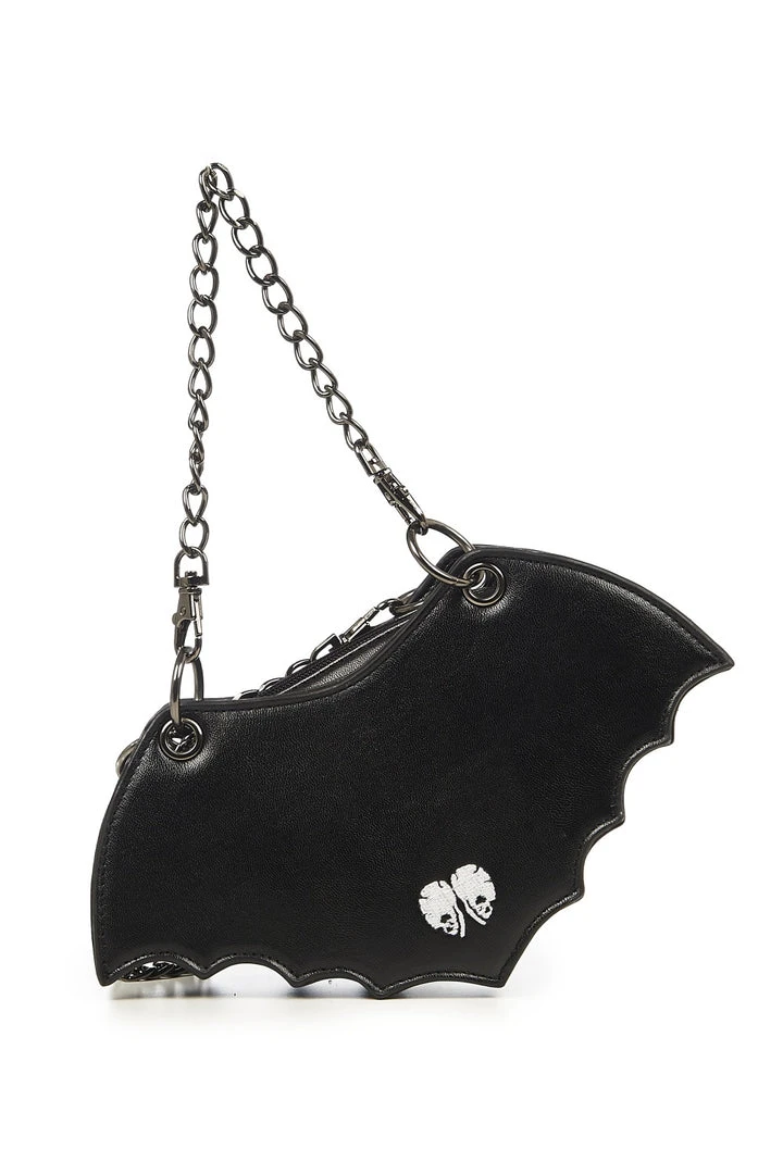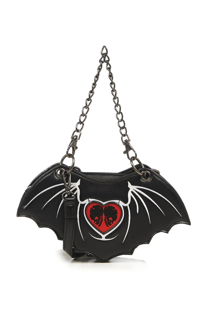 Bat Out of Hell Bag by Banned Apparel. Bat shaped bag, with embroidered heart design on the front and embroidered skull heart on the back.