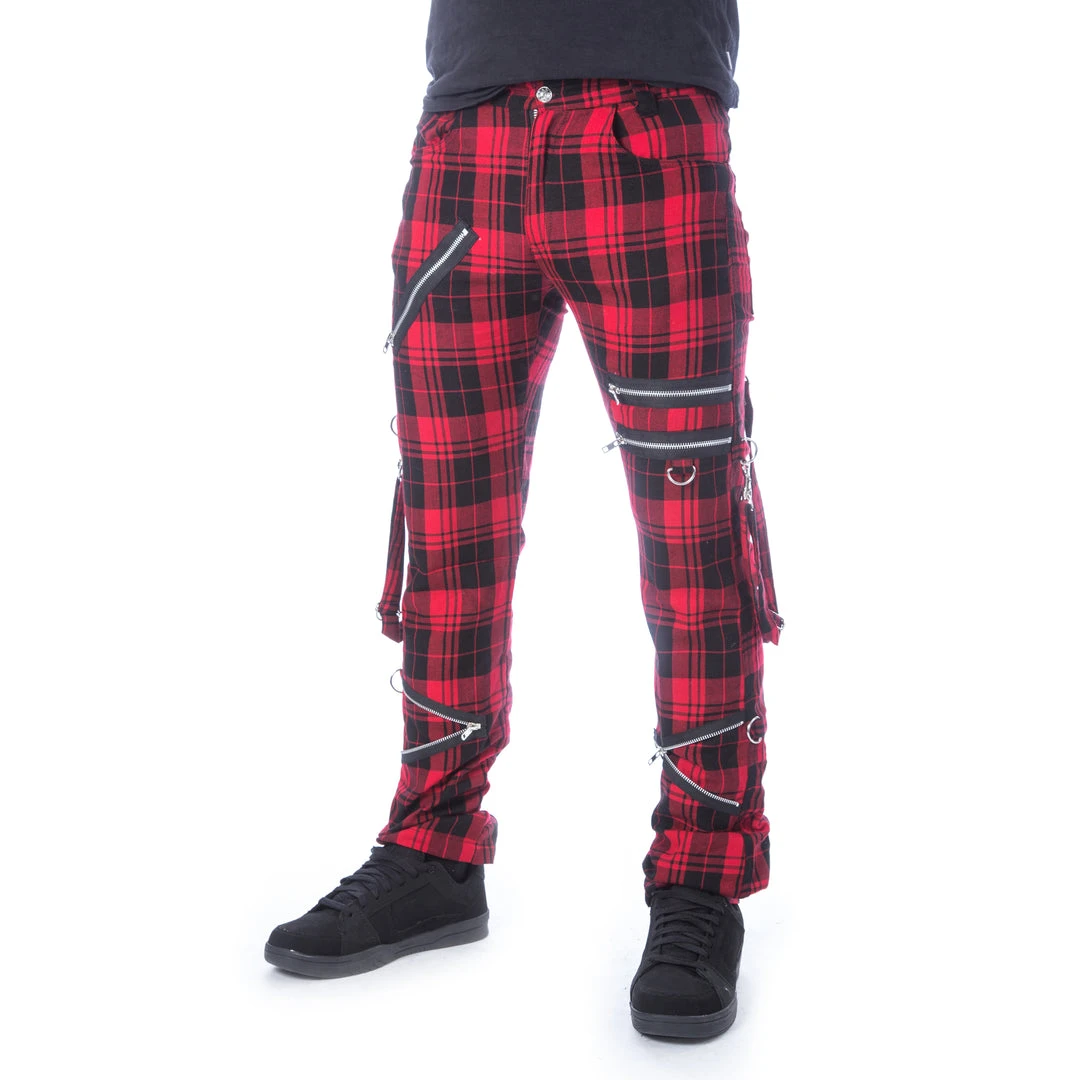 The Etienne Pants by Chemical Black are super-soft red tartan, slim fit pants for men with zipper accents,detachable bondage straps and D-rings.