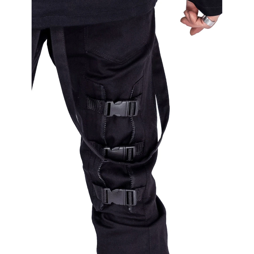 The Diego Pants by Chemical Black are slim fit pants with black straps, zipper accents, and clips on the back of the legs and detachable straps.