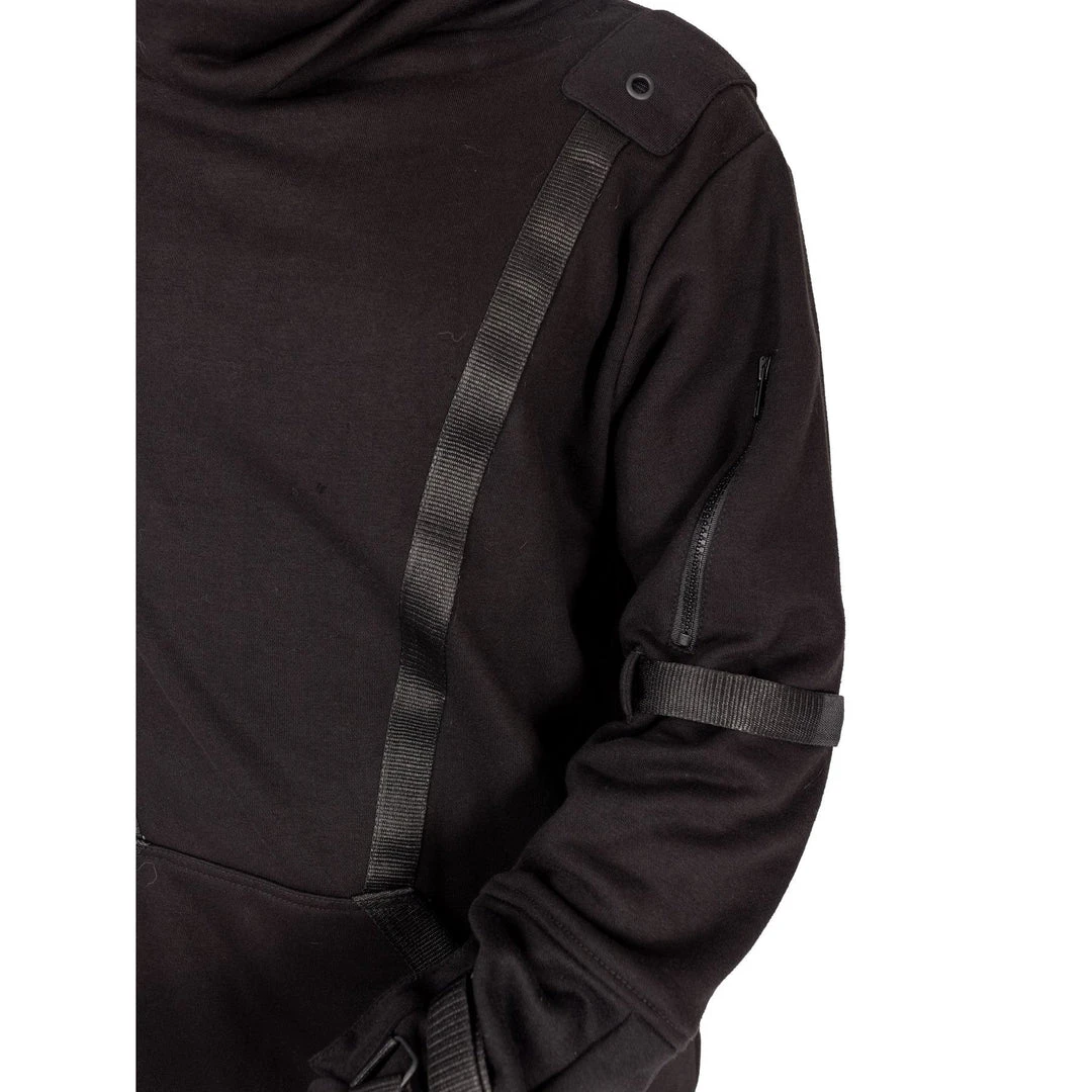 Black hooded pullover jumper with thumb holes, black straps, zipper accents and large, oversized collar.