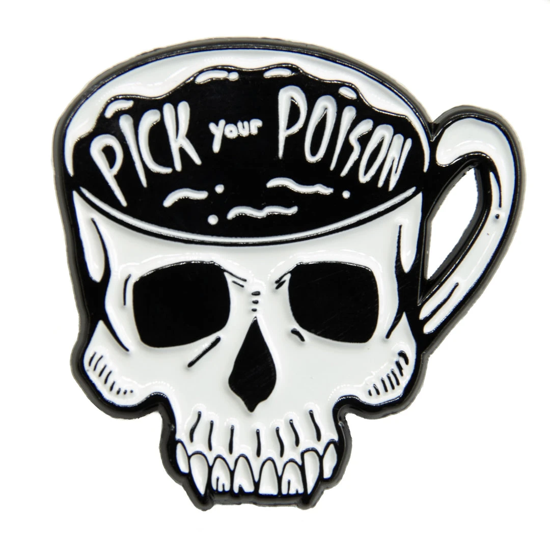This spooky enamel pin features a coffee cup shaped like a skull with the quote, “Pick Your Poison”. It makes a great gift for caffeine addicts and tea drinkers alike! Wear on your jacket lapel, hat, or backpack for goth flair.