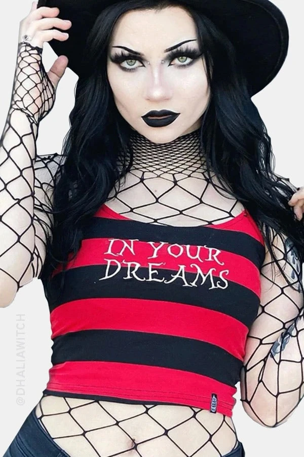In your Dreams baby. If you love all things spooky this is for you. This super cute cropped black and red striped top has just the right amount of stretch for a perfect fit. It features embroidered “In Your Dreams” detail and a cute little spooky branded tag in the bottom right corner.
