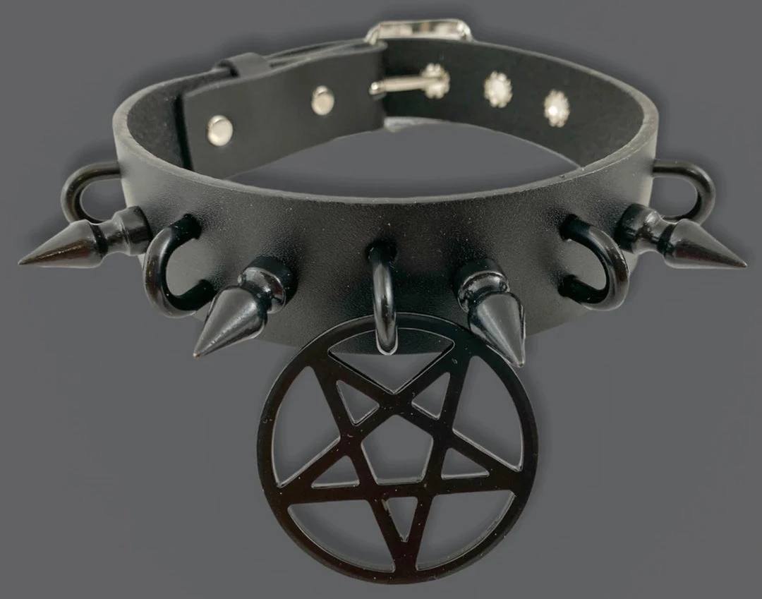 1 1/4″ GENUINE-LEATHER CHOKER WITH U RING AND 2″ STAINLESS STEEL PENTAGRAM RING AND 1″ SPIKE