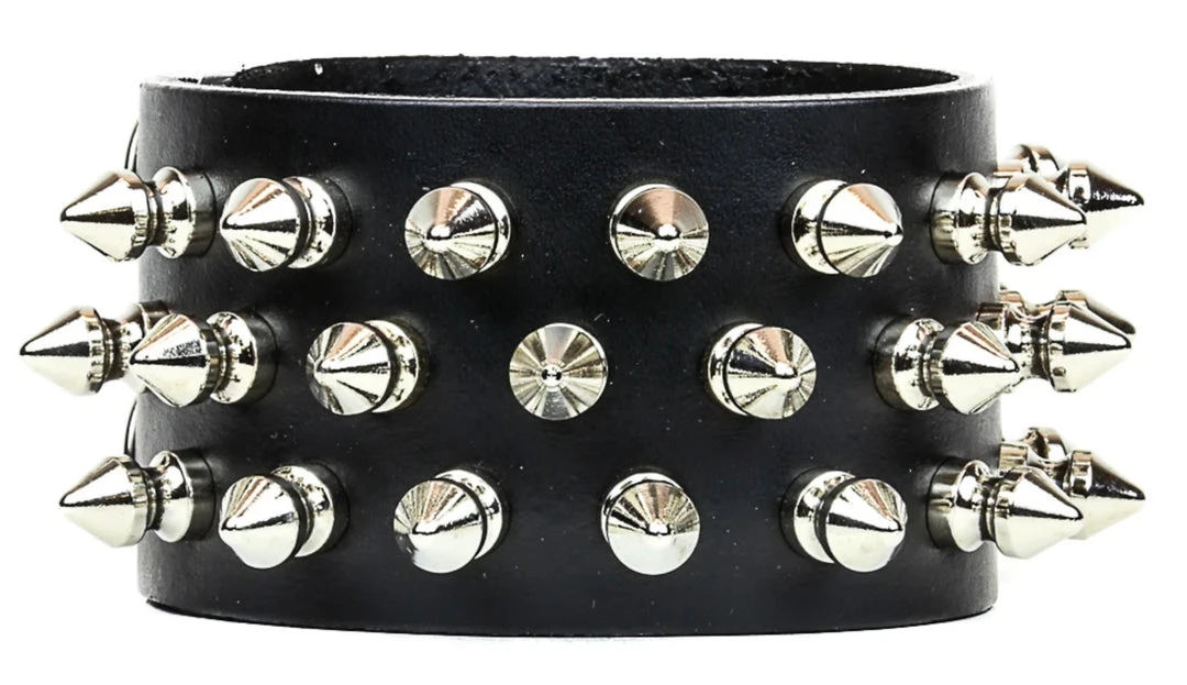 Snap bracelet with 3 rows of 1/2″ spikes. Leather with 2 rows of adjustable snaps.
