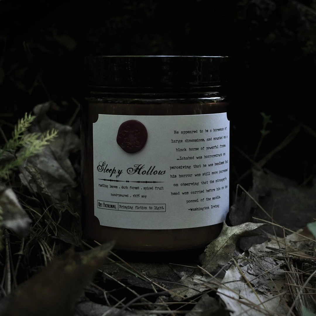 The Sleepy Hollow candle is a blend of spiced fruit, apple, autumn leaves, cedarwood, and tonka.