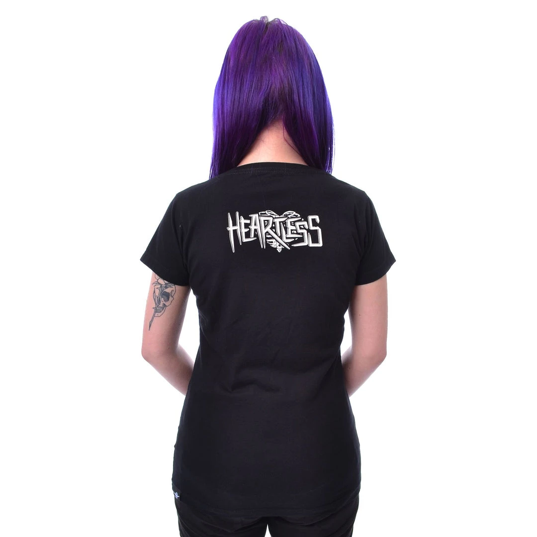 Dead Inside fitted women’s fitted t-shirt featuring a coffin and upside-down cross discharge ink graphic.