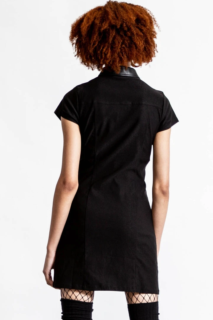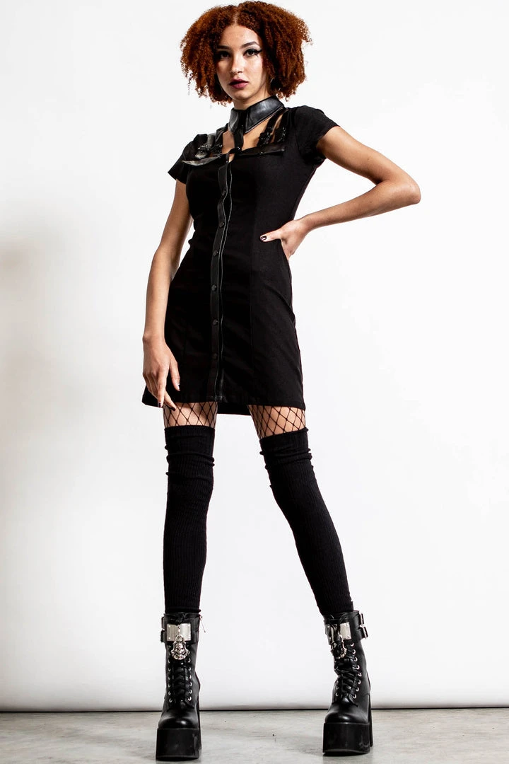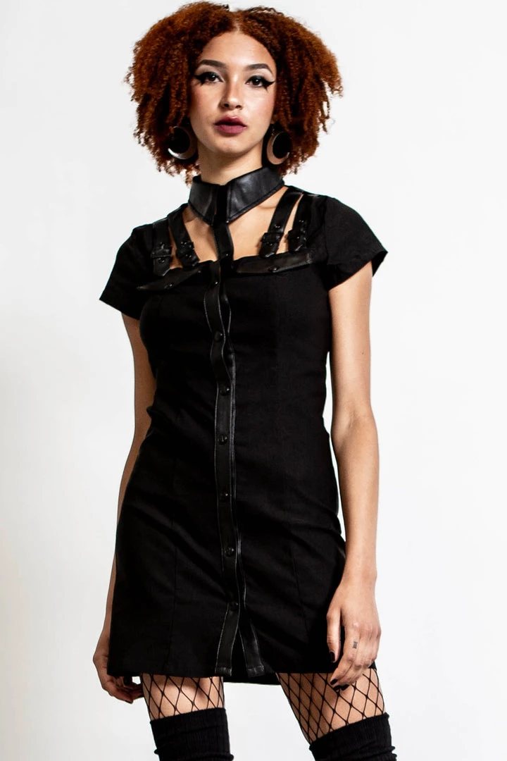 No desire to fit in. Turn heads in our ‘All Attitude’ cut-out dress; conjured using a soft stretchy material for the perfect fit. No detail has been spared- features a statement collar, cut-out detail, short sleeves, button front and buckle accents. The perfect piece for some added punk!