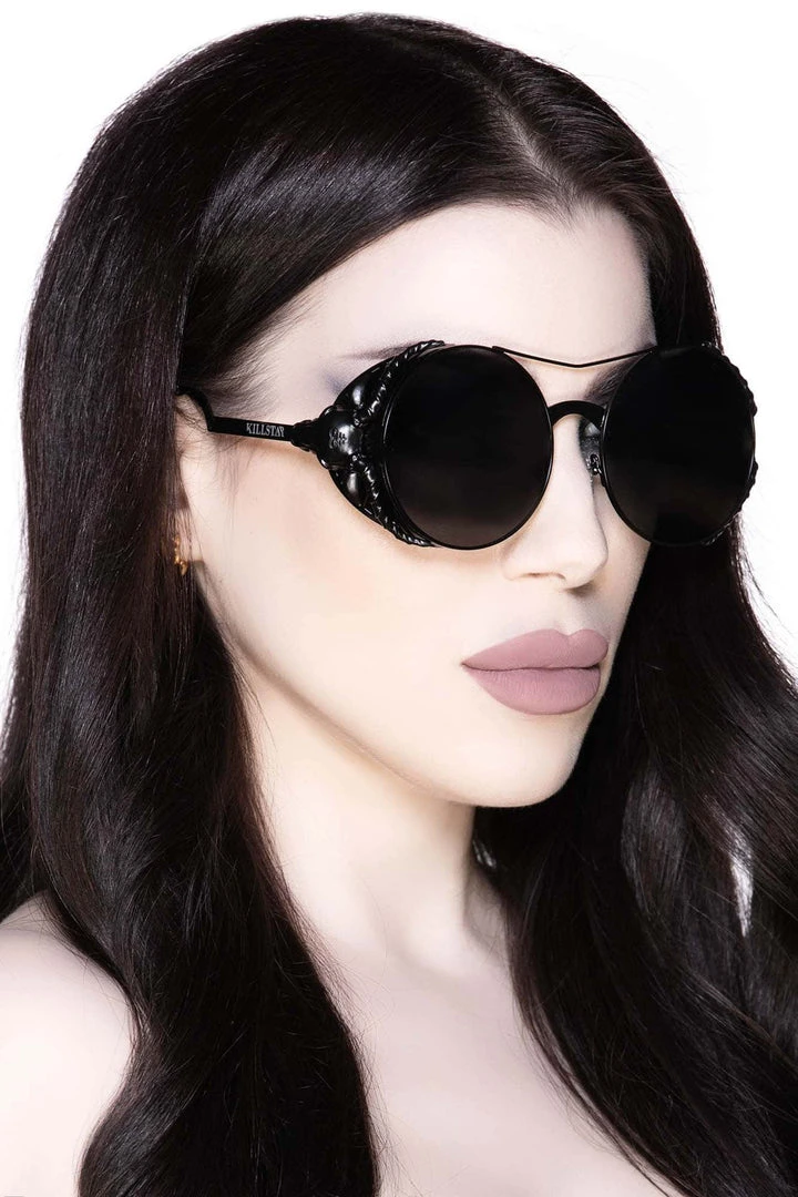 The moon is my sun. ‘Baphomet’ sunglasses are for channeling some effortless vibes whilst keeping it dark – with baphomet detail at the sides and round lenses. Black style with custom frames + gradient lenses. 100% UV protection.