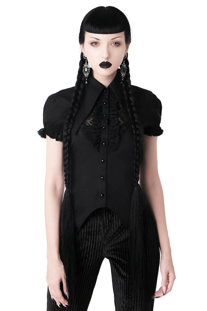 Stop Lucifer in his tracks by looking sinful in the ‘Devil’s Claw’ shirt; conjured using a super-stretch fabric which stretches to perfection for a flawless fit! Complete with exaggerated collar, delicate lace accents and button-up front. This lil gothic statement piece is a dream to style – perfect for all yer wicked adventures from dusk to dawn!