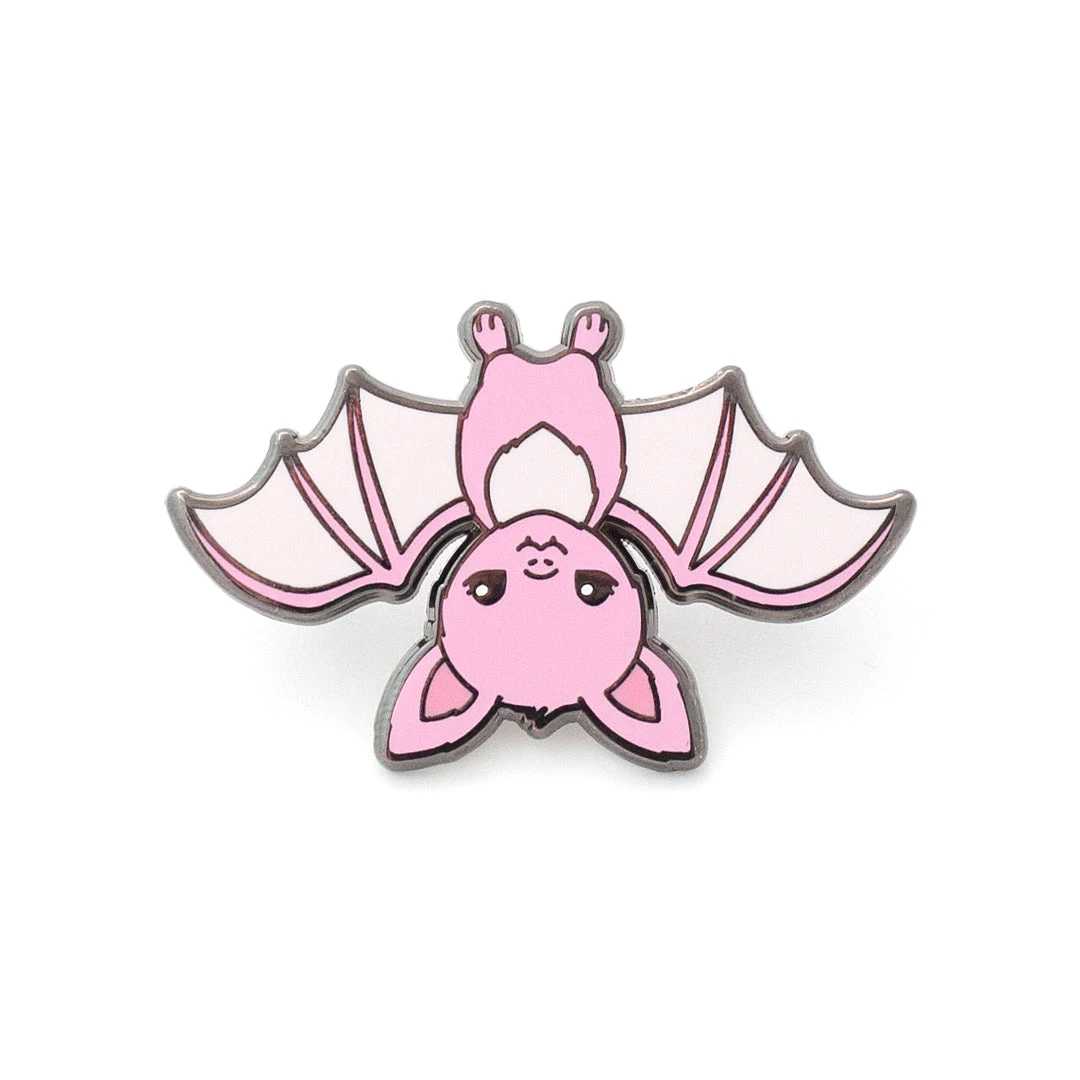 Pink Bat Enamel Pin with two pin backs add security and allow you to wear it upside down, upside right or flying.