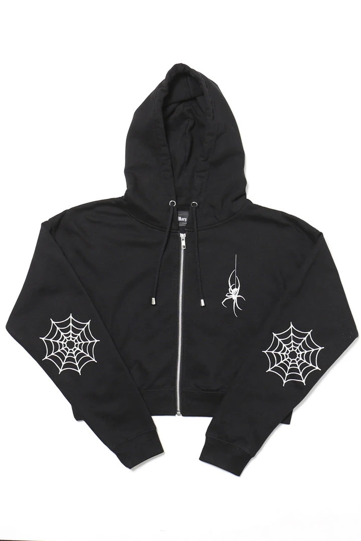 In a jet black hue; this hood is finished with contrasting white printed graphics in ode to our favourite widow friend alongside our signature cobwebbed elbows.