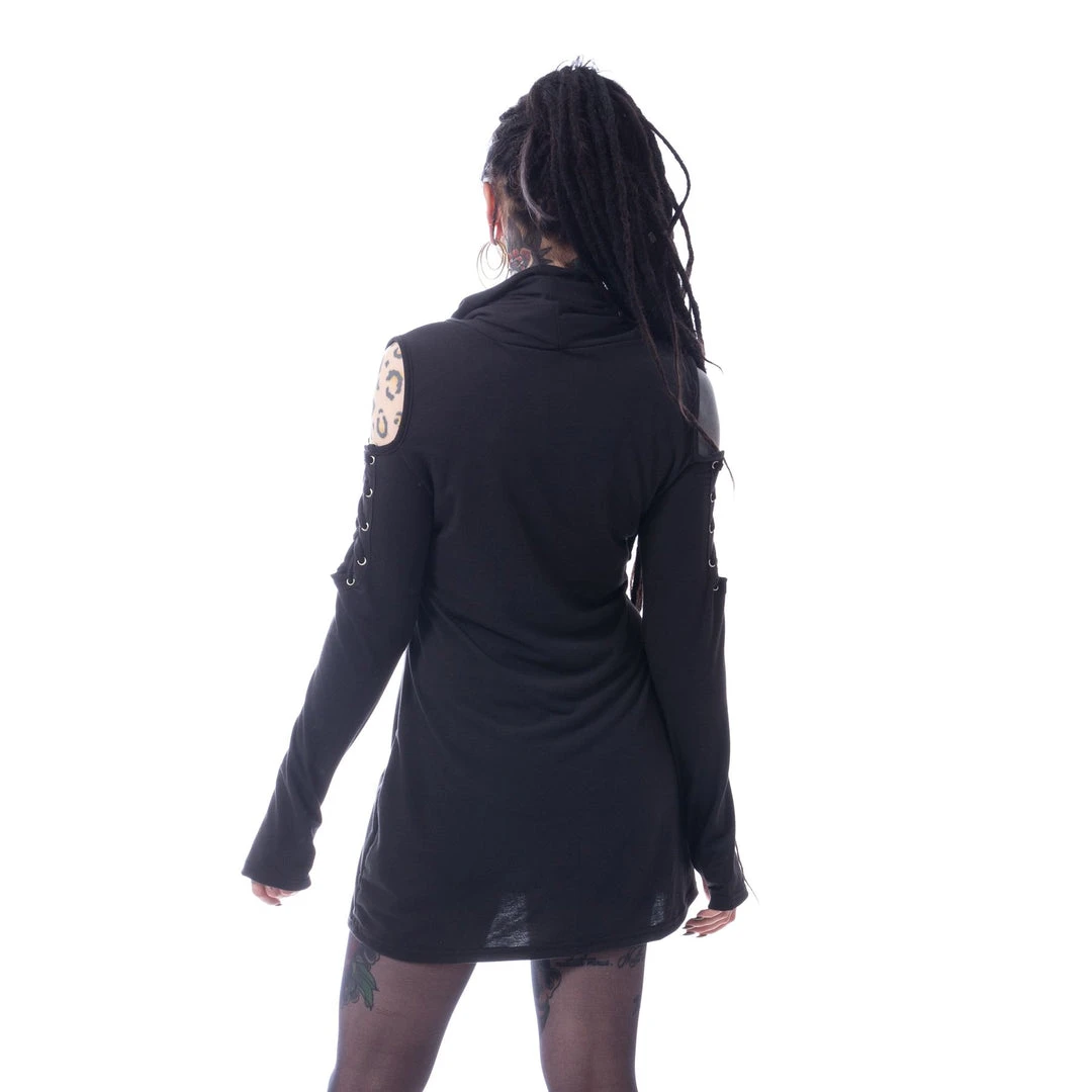 The Fash Top by Poizen Industries is tunic length with a cowl neck, eyelet details and features a front pocket. lace-up cold shoulder, long sleeves with thumb hole cutouts at the wrist.