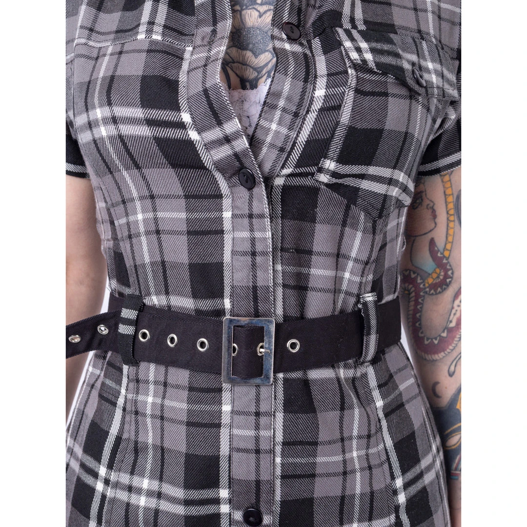 Grey plaid shirt dress from Poizen Industries. This cute dress has short sleeves, button us up the front and a belt.