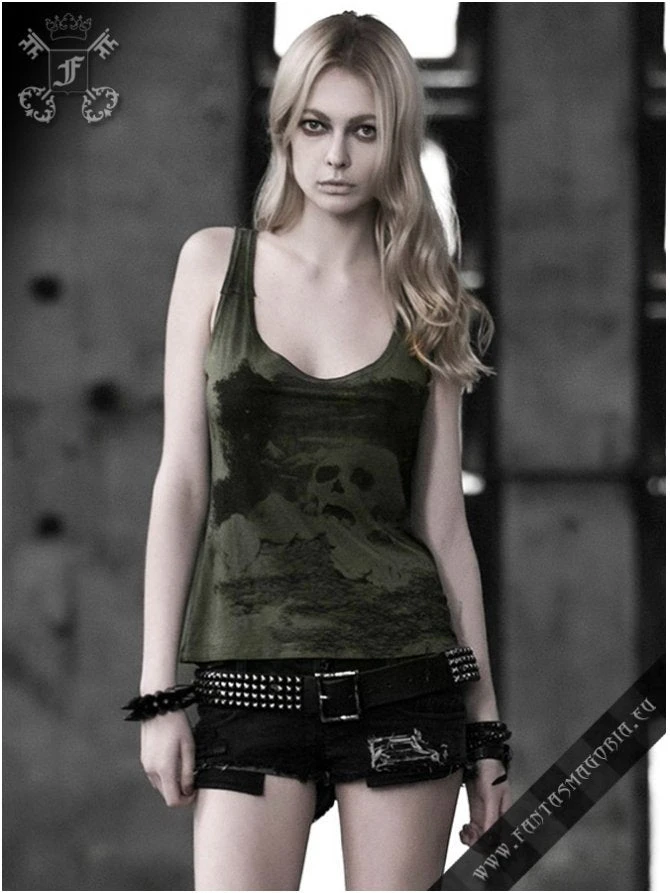 Ombre wash green tank top with a skull print at the front and the skull brooch-patch on the shoulder.
