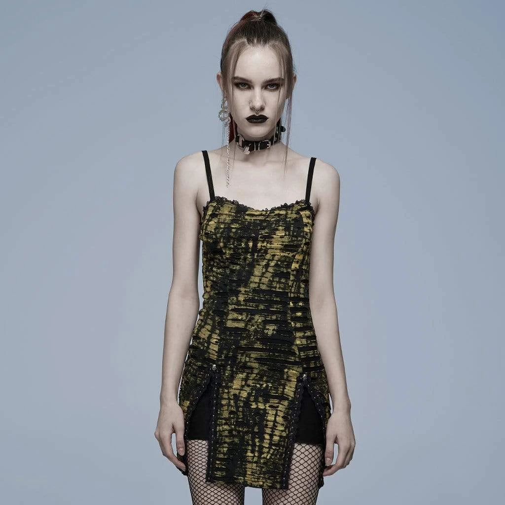 Black and yellow,, layered, tunic-style ripped dress with spaghetti straps and metal skull accents.