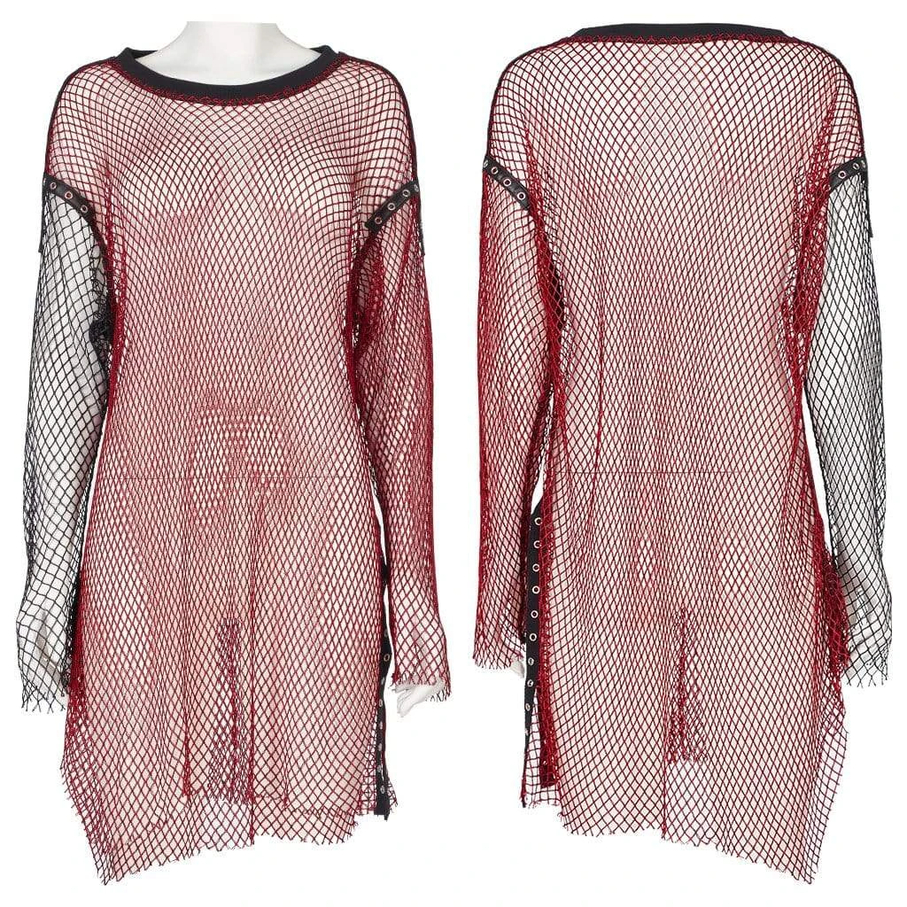 Black and red, oversized, long sleeve mesh top with vegan leather straps stitch tot he shoulders and sleeves.