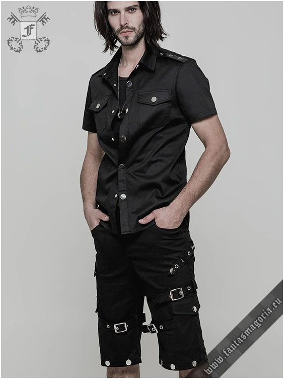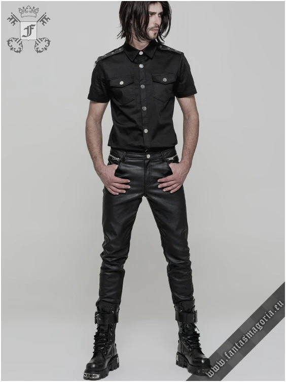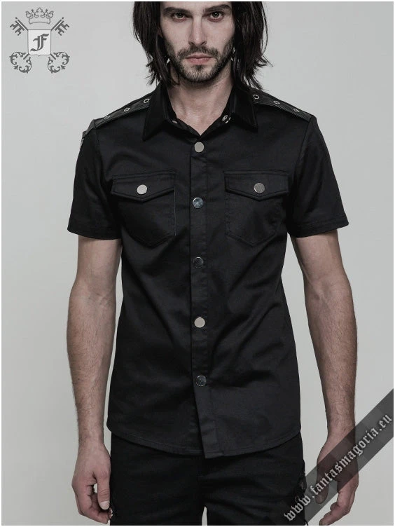 Gothic casual wear men’s black short-sleeved shirt with synthetic vegan leather epaulets.