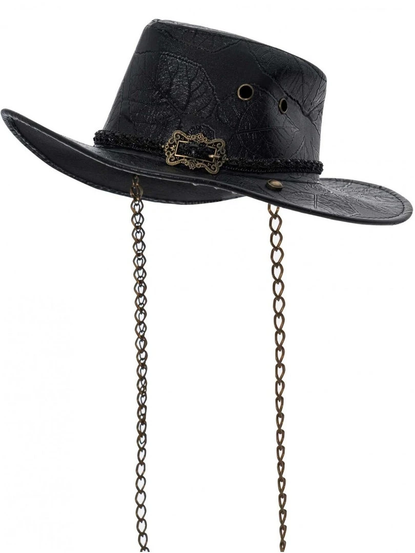 the Dawnrazor Hat (aka Steam-Rider Hat) is an iconic cowboy hat made of finely carved Pu leather. Braided band with beautiful antique gold metal buckle, antique gold metal chain neck straps and details.