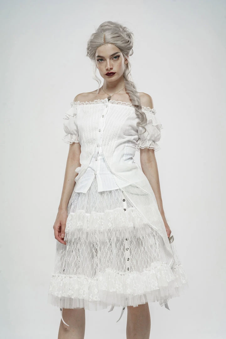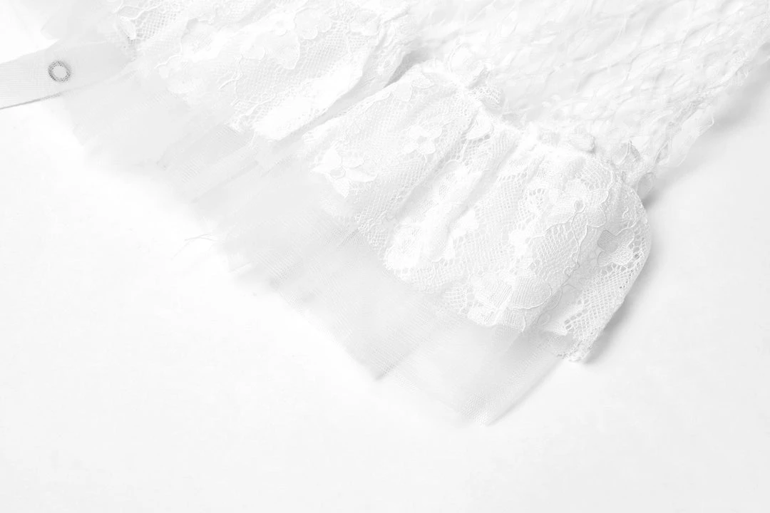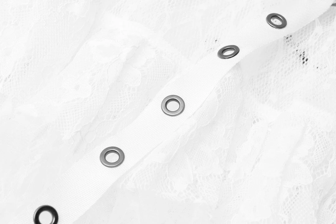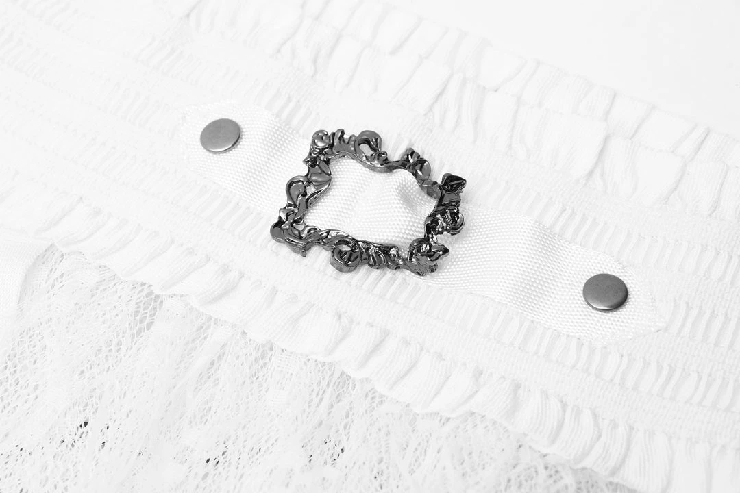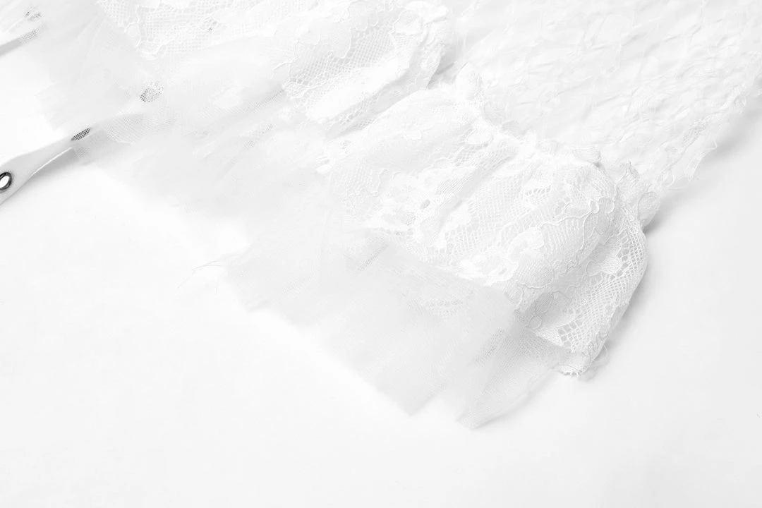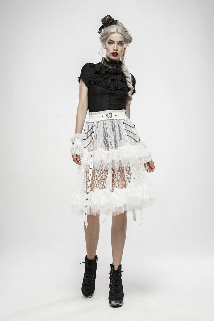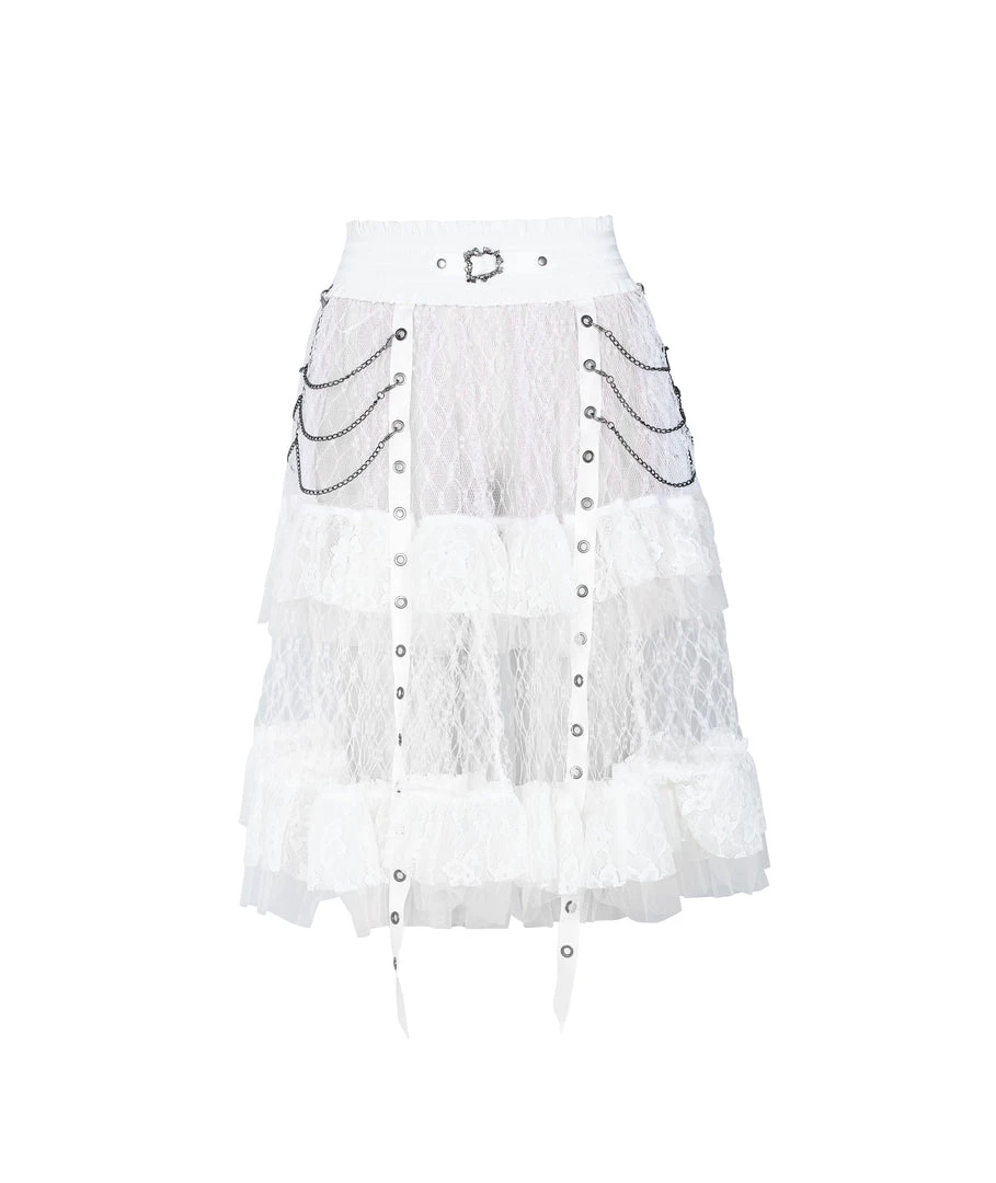 A long, high-waisted, multilayered mesh skirt by Punk Rave. Features wide mesh with ruffle, chains, and strap accents.