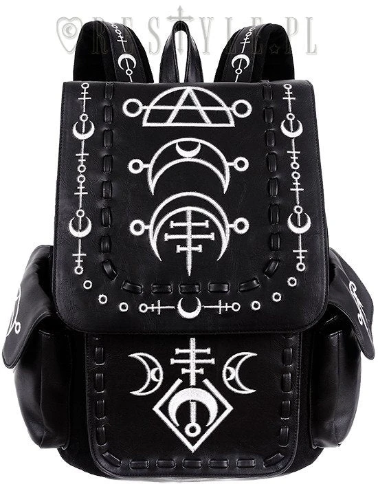 The main flap, pockets and arm straps are adorned with moon embroidery.