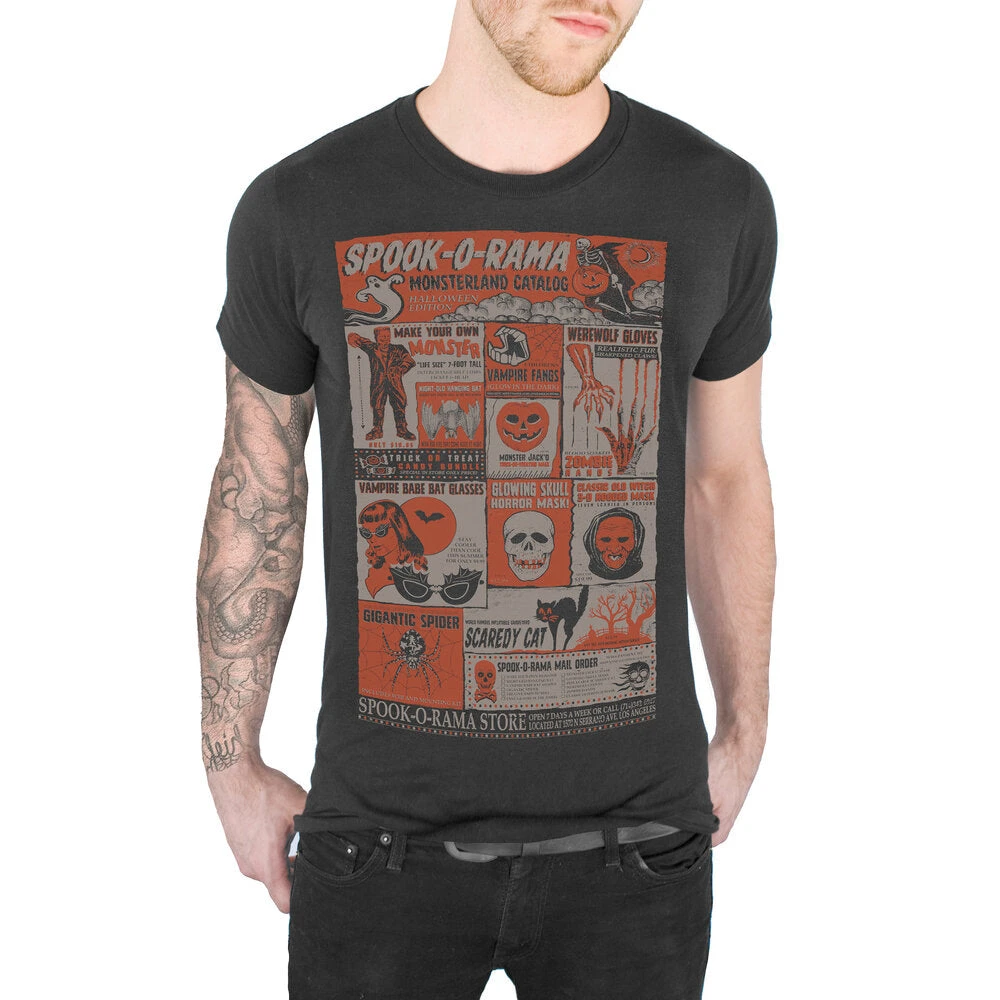 Spook-O-Rama Men’s crew neck tee is Vintage Orange and Cream colored on Black. 100% Cotton and pre-shrunk.