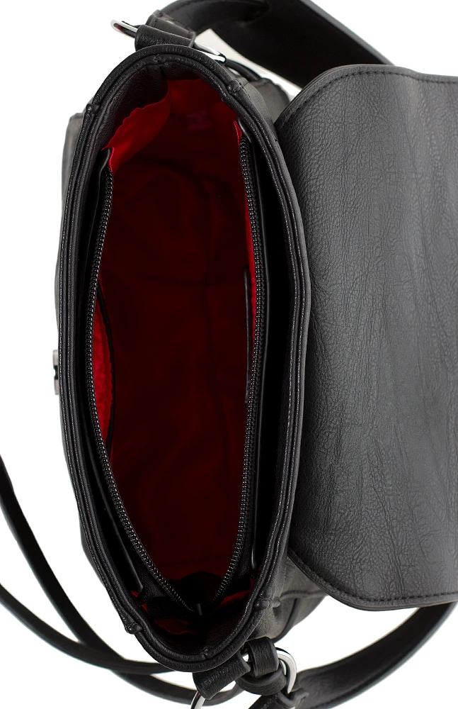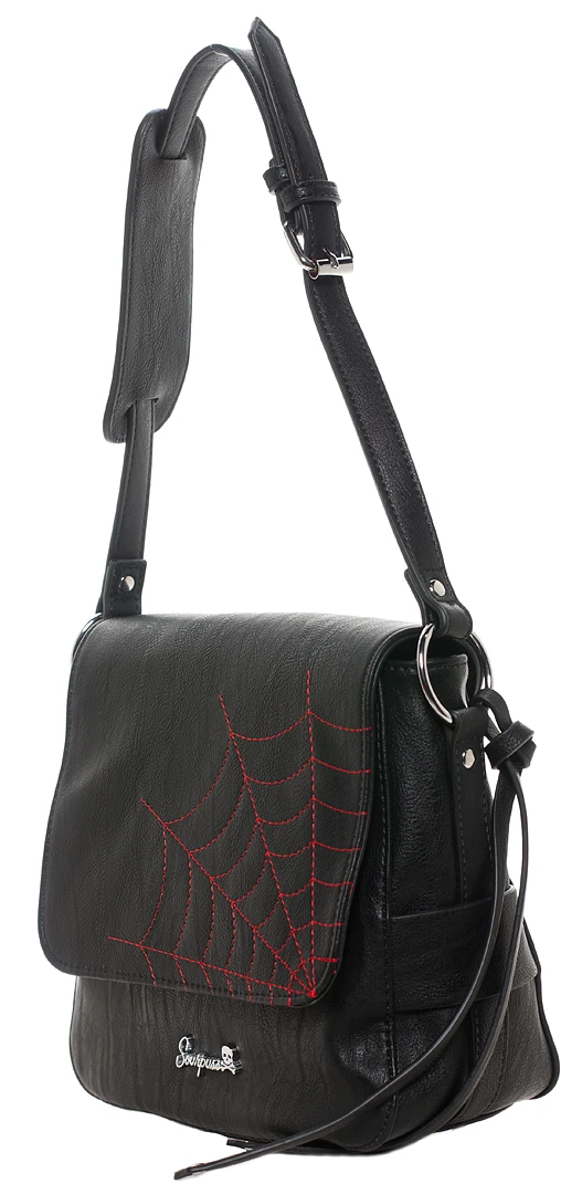 The Sourpuss Triumph Purse has everything you’re looking for, in one seriously amazing package! Made from soft matte black vinyl, this shoulder bag includes a zip top with front flap that secures with a magnetic snap closure, tassle accents, protective metal feet and interior pockets for storage. And as if that wasn’t enough, the front features our amazing web embroidery in red, and has gorgeous red & black striped interior lining.