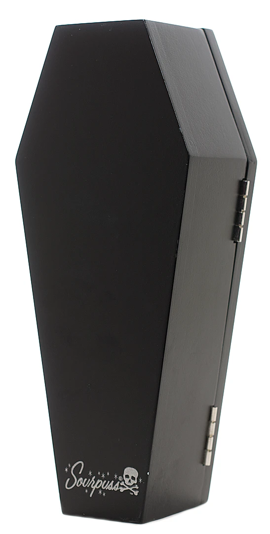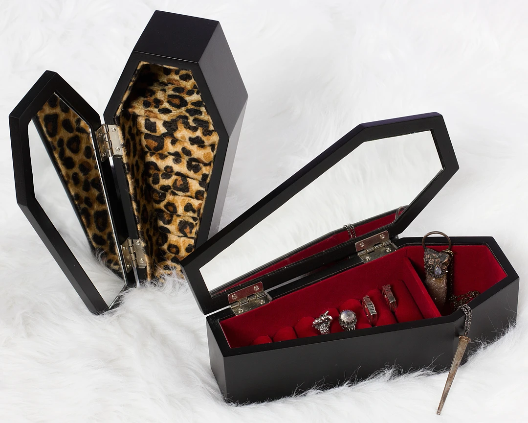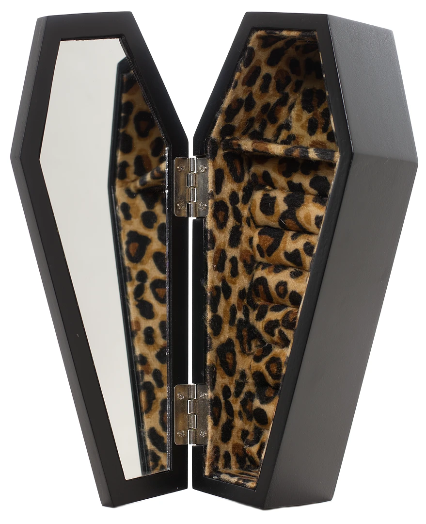 If your sensibilities are more than a little macabre, typical jewelry storage just won’t do! Our Coffin Jewelry Box absolutely belongs in your crypt and we think you’ll agree! This sturdy, black box features a hinged lid with interior mirror and soft leopard interior lining. Inside compartment and cushioned rows are perfect for storing your favorite rings, brooches, pins, or any other precious treasures that you plan on taking to the grave.