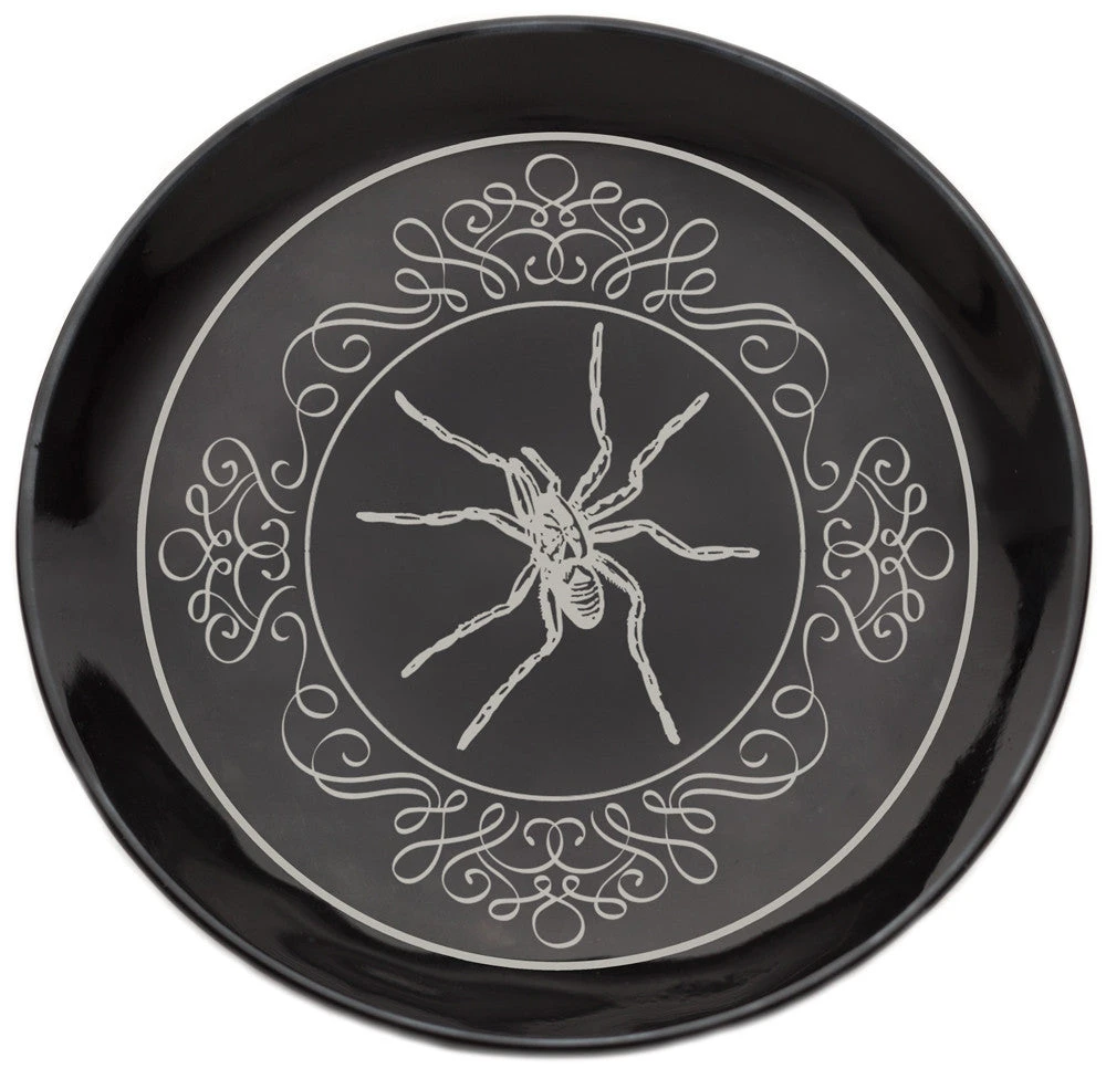 This trinket dish is a perfect catch-all for loose coins, jewelry and any other small, vagabond items in need of a home. It features a vintage spider illustration surrounded by filigree, printed in metallic silver on a black porcelain dish. Put one by your sink, dresser, night stand or wherever you need it!