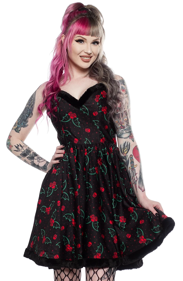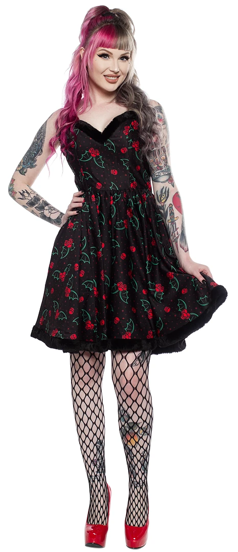 If you’re looking to cause a stir this holiday season, then the Holly Bats Sophia Dress is the ticket! It’s trimmed with black faux fur along the sweetheart neckline and hem, has adjustable straps and pockets! But of course, the best part is the pattern of festive holly berry skulls and bat wing leaves, it’s perfection!