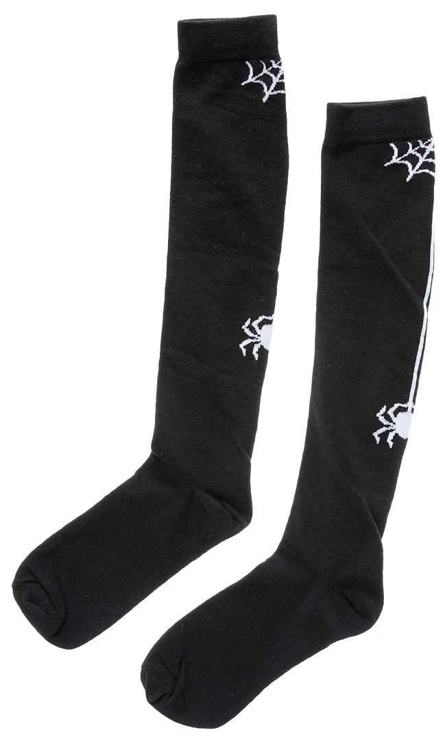 We’re all wound up in this web! These black knee socks feature a spiderweb at the back knee, with a descending arachnid. Pair ’em with just about anything to add a morbid touch to your ensemble.