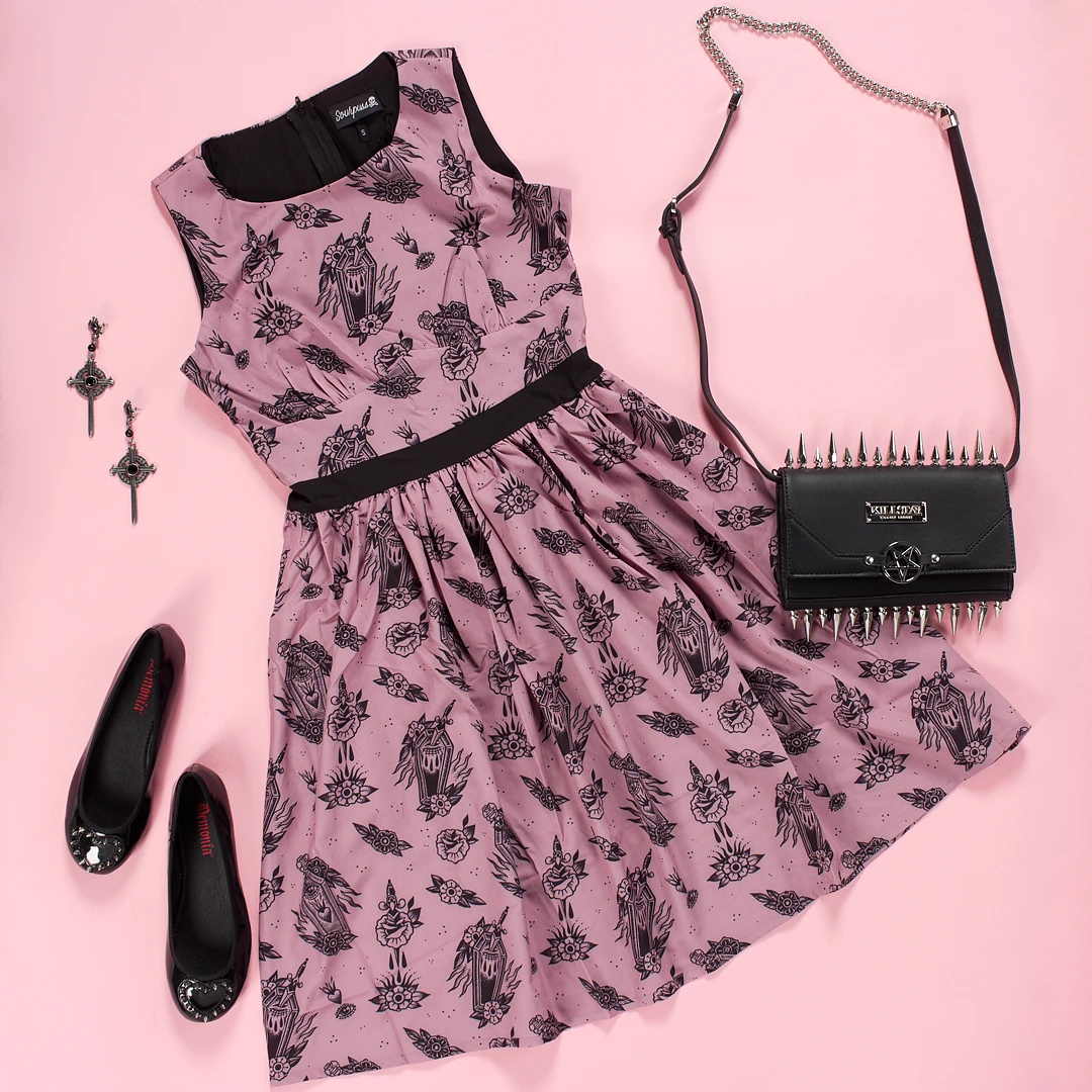 We love the dreamy mauve hue of the Sourpuss Die in Grace Shift Dress. It’s the perfect background for the macabre artwork of Ana Pantera – coffins, hearts, and roses! This dress has a flattering vintage silhouette, wide waistband, and hidden pockets!
