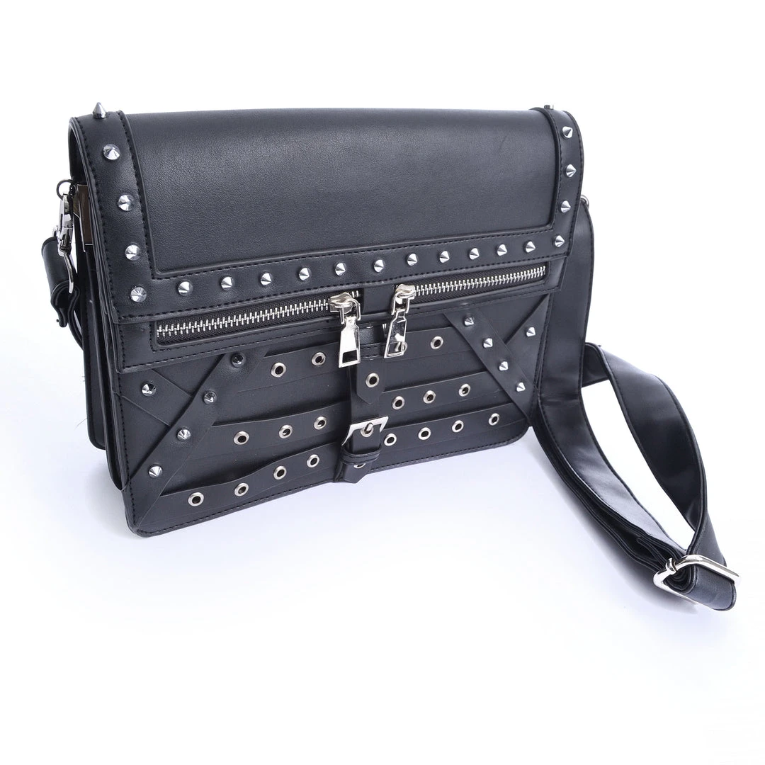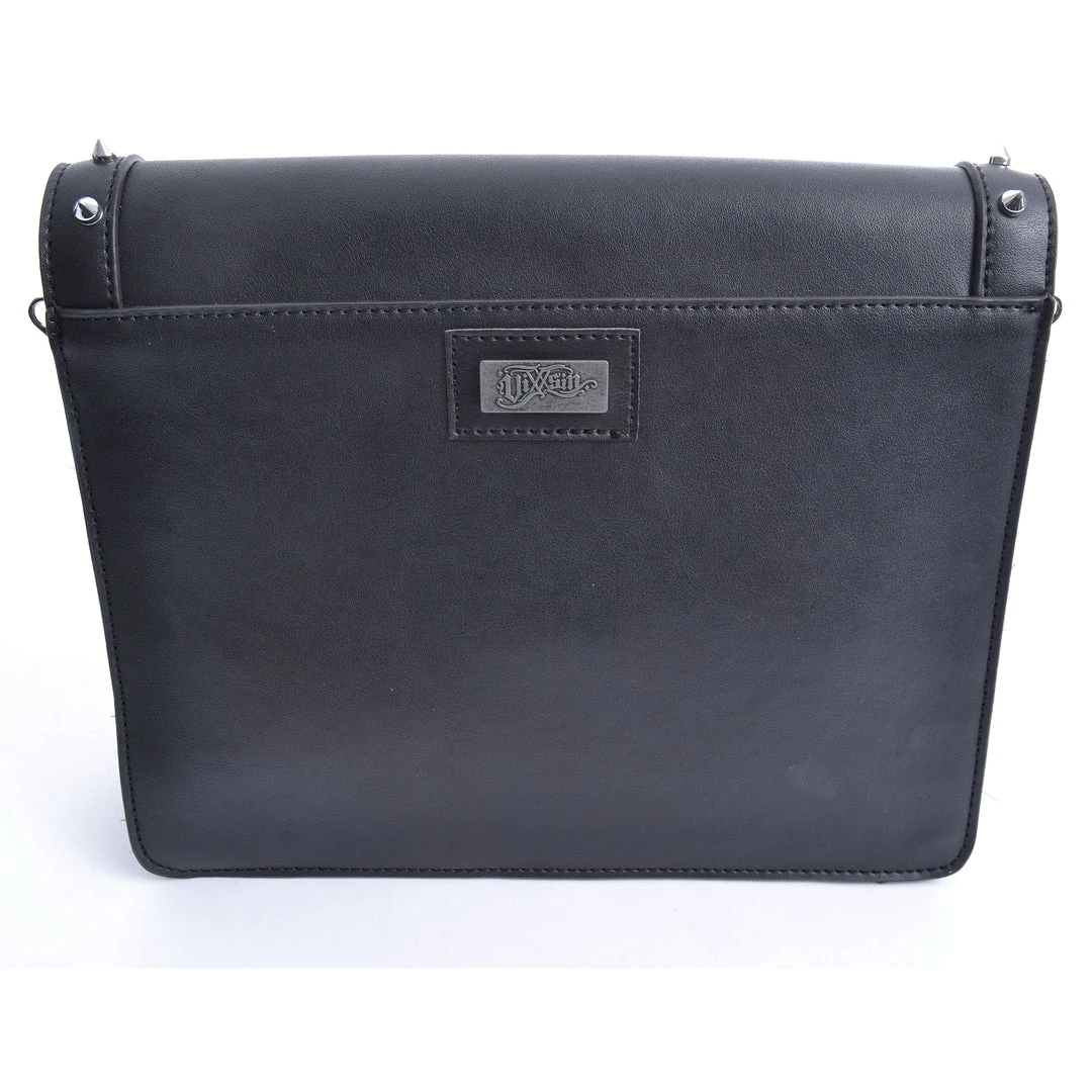 Black vegan leather bag with silver zipper, cone stud and eyelet accents and magnetic snap. Comes with a cross body strap. Inside is 2 large compartments divided by a large zipper pocket. One compartment has a zippered pocket and the other has an open pocket that is big enough for a cell phone.