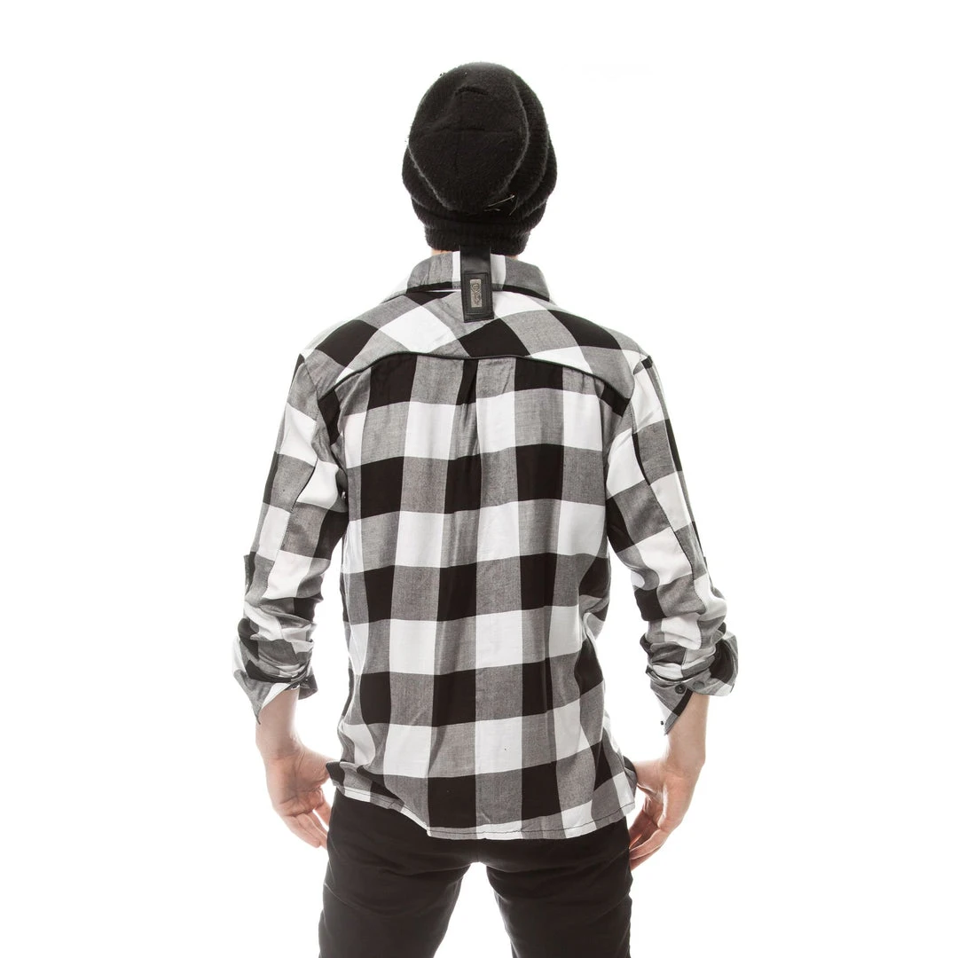 Black & white checked, lightweight shirt with black faux leather straps & d-rings on the front pockets, faux leather strap on the back collar.