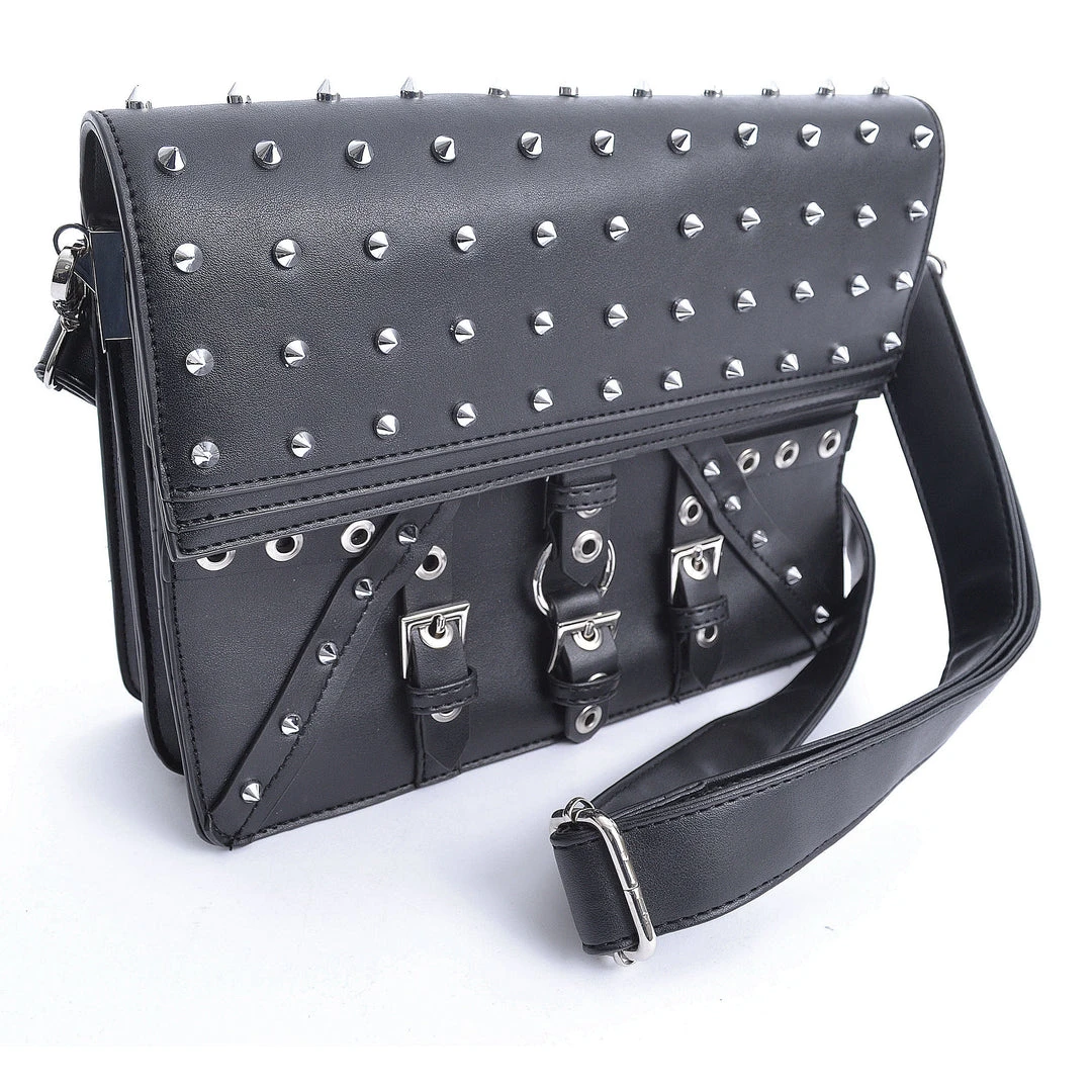 Black faux leather handbag featuring silver cone studs, buckles and straps with a magnetic closure. Features a detachable strap and can be used as a shoulder bag or a clutch.